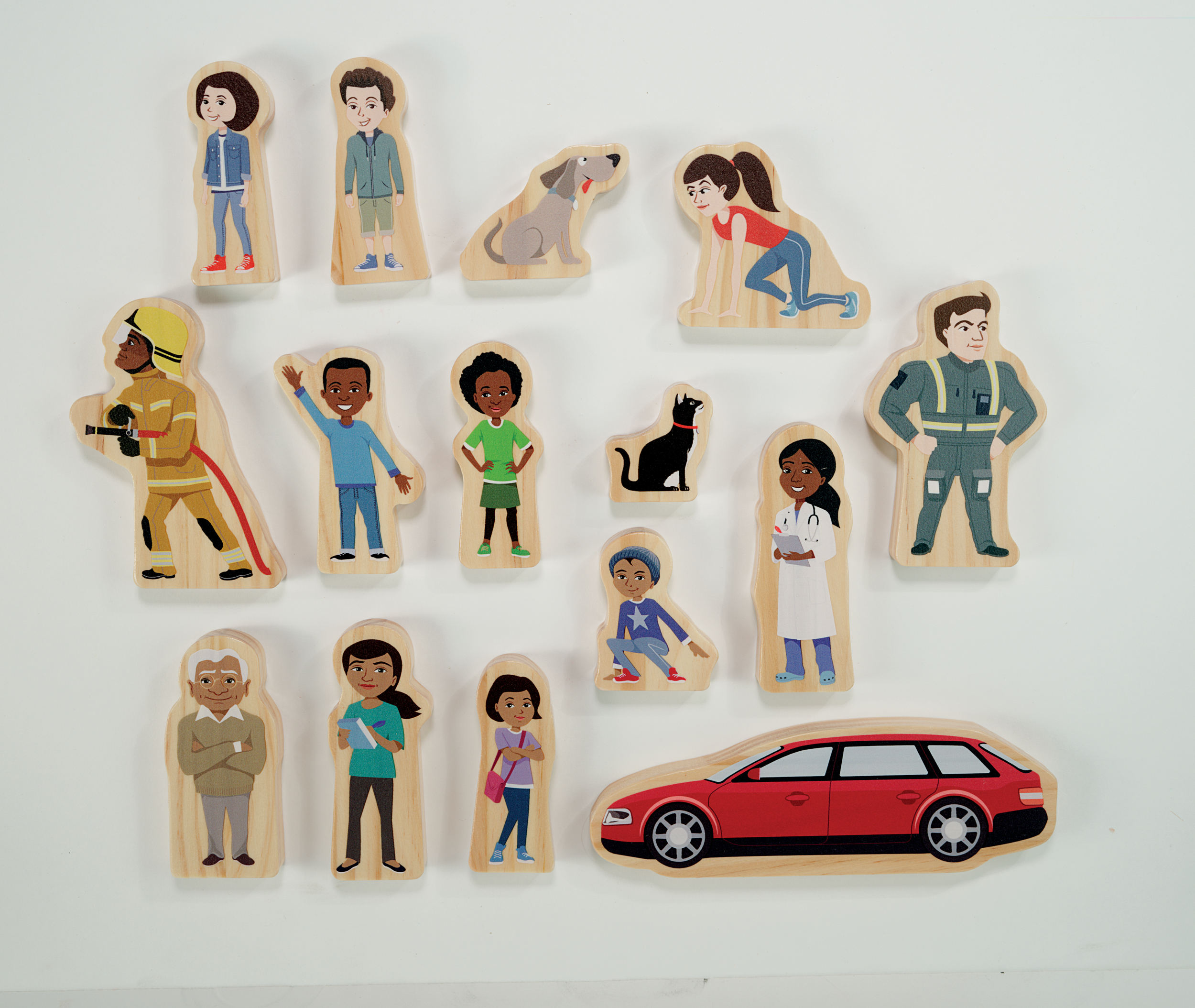 This multicultural set of superheroes consists of three families, of which each member can be transformed from their everyday persona to their superhero alter ego. Several of the adults in the set have community helper roles, being heroes in their own right. This wonderful, engaging set of 15 double-sided figures is guaranteed to inspire lots of story talk and language. Each character has a 15mm wide, sturdy flat base making them easy to stand up in a variety of superhero adventures. They are made from FSC-certified pine and measure between 47–115mm high. Safe for age 18m+.