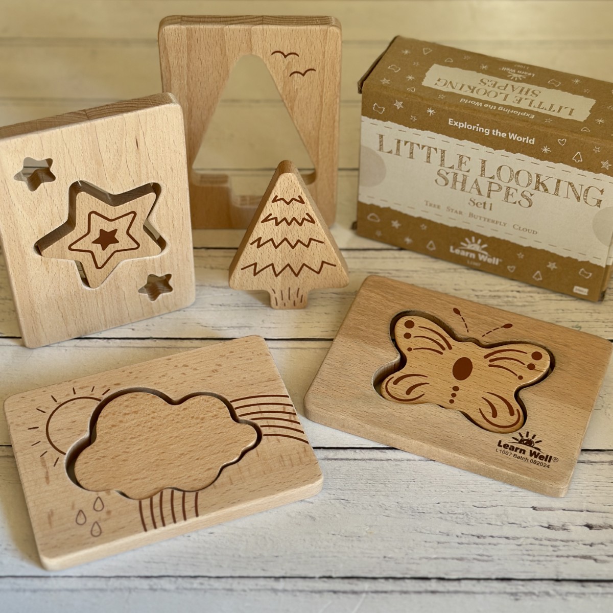What can you see when you look through the shapes? Clouds, flowers, sand or sea? Buildings, cars, people or planes? These versatile Little Looking Shapes give children a fresh view of their world. Fit the pieces into the shapes, draw around them, fill them with sand, beads, buttons or squish them into play dough. The opportunities for learning through play are endless! Set of four shapes, 8 pieces: Tree, Star, Cloud and Butterfly.